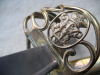 Gegossenes Tombak-Korbgefäß mit abklappbarem Gefäßteil an der Quartseite und Herrschermonogramm im Oval an der Terzseite. Griff mit feiner Rochenhaut bezogen und mit dreifacher Kupferdrahtwicklung. Unterhalb des Knaufs ist ein kleines Stück Holz ausgebrochen. Leicht gekrümmte Steckrückenkllnge mit Spitze inm der Mittellinie. Kein Hersteller, keine Gravuren, minimal fleckig, aber keine Oxydation. Geschwärzte Metallscheide mit dreifachem Tombakbeschlag und zwei Trageringen.