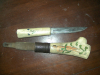 Biete Jagdmesser, ca .20cm. lang, bemalter Knochengriff und Scheide . Stempel: YRSTAD. Von Privat