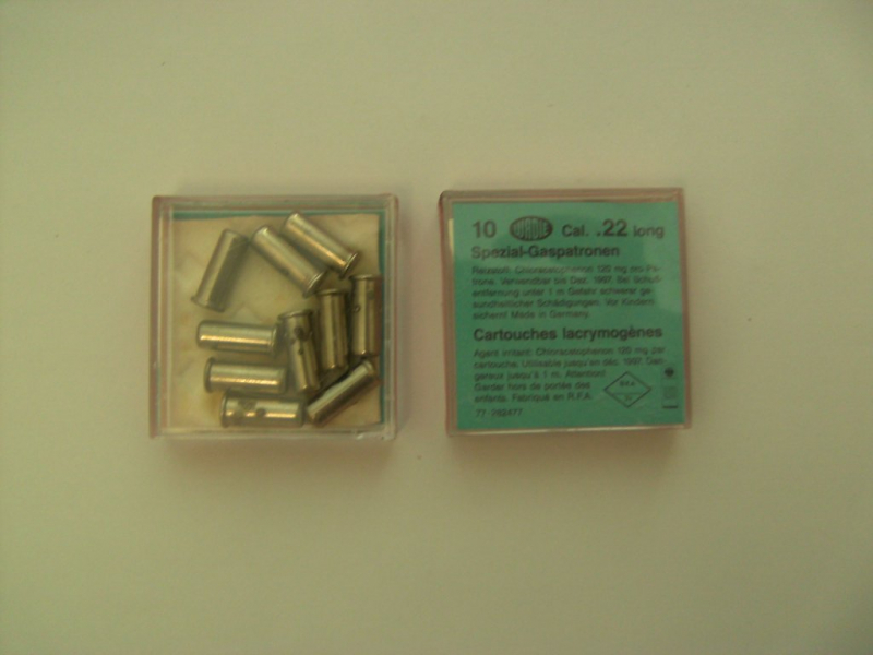 Zum Verkauf steht je 1 Packung Gaspatronen (10 Stück) im Kaliber .22 der Firma WADIE. Wirkstoff 120 mg Chloracetphenon pro Patrone. Die Munition ist noch original versiegelt, jedoch weist sie vereinzelt Verfärbungen und Korrosionsspuren auf. ACHTUNG, WICHTIG: die Munition ist laut Verpackung verwendbar bis Dezember 1996, d.h. die Haltbarkeit ist bereits deutlich überschritten. Ob die Munition noch funktioniert entzieht sich meiner Kenntnis. Munition wurde fachgerecht gelagert. Munition ist original versiegelt. Ist wohl eher für Sammler interessant. Bitte beachten Sie auch meine anderen Auktionen. Bei Bestellung mehrerer Artikel fällt selbstverständlich nur einmal Porto an. Der Käufer trägt die Versandkosten. Bezahlung bitte per Überweisung. Versand erfolgt schnellstmöglich nach Zahlungseingang. Privatverkauf, keinerlei Garantie, Gewährleistung oder Rücknahme. Altersnachweis erforderlich (bzw. ID-Mitglied).