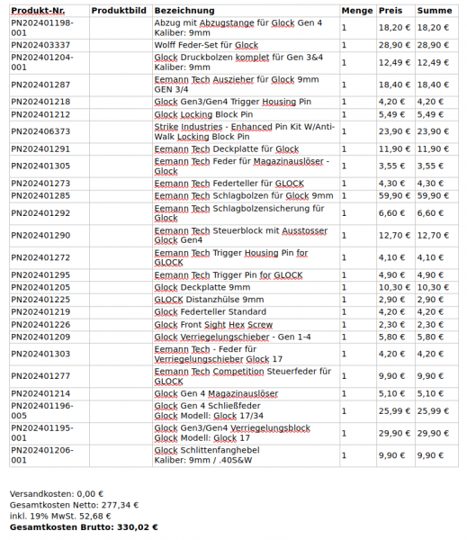 Außer den Teilen auf der Liste sind noch dabei: Ein Steuerblock Gen 3 mit Ausstosser, ein Abzug Gen 3+4 mit Abzugsstange