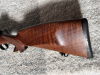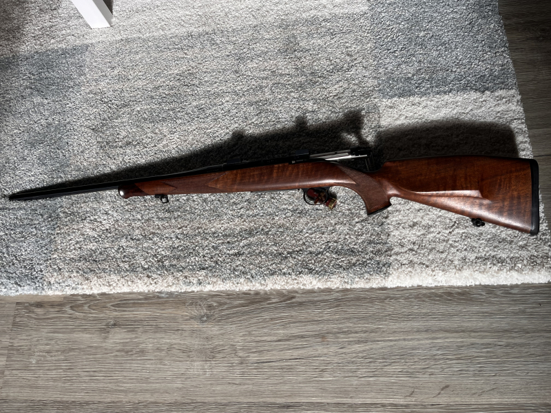 Zum Verkauf steht hier eine Heym SR 30 im Kaliber .243 Win. mit Mündungsgewinde (M14x1). Die Büchse weist leichte Gebrauchsspuren auf, die das Gesamterscheinungsbild und die Funktion jedoch nicht beeinträchtigen. Der Lauf und die Kammer sind blank, die Felder und Züge scharf. Der Lauf weist eine Länge von 52cm auf, was die Büchse schön führig macht. Die Schussleistung mit verschiedenen Laborierungen (bleihaltig u. bleifrei) ist hervorragend. Selbst auf dem 300m Stand macht sie eine gute Figur. Der Abzug bricht heymtypisch bei etwa 850g. Zum schnelleren repetierten ist ein Matchgriff montiert. Dieser kann jedoch ohne weiteres gegen eine Kugel getauscht werden, wenn man möchte. Auf der Büchse befinden sich EAW-Schwenkmontage-Basen.