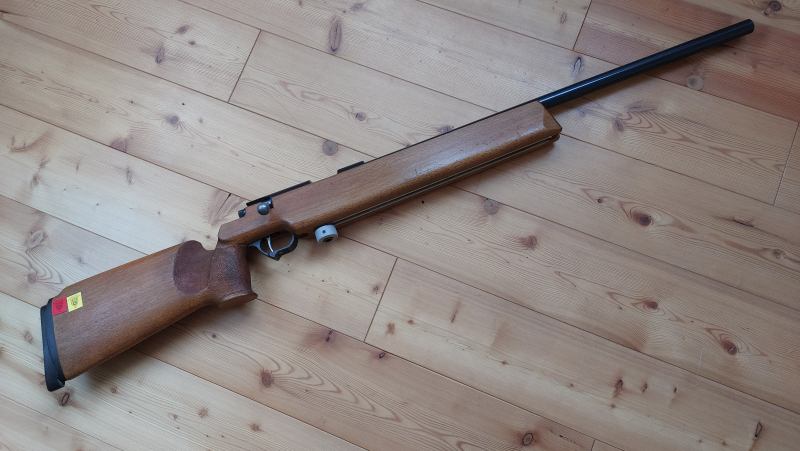 Schaft der Waffe wurde so bearbeitet, dass die Backe abgetragen wurde und der Pistolengriff linksseitig ausgearbeitet wurde, damit er für Linksschützen geeignet ist.