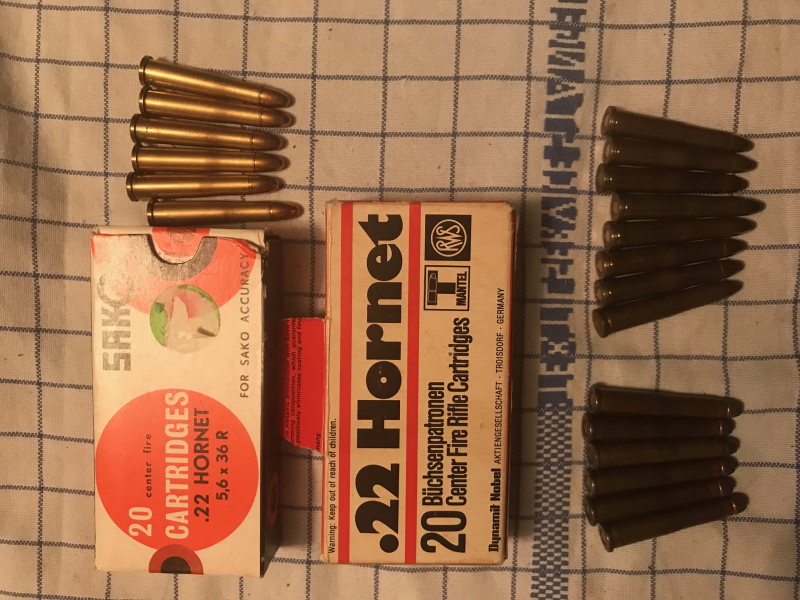 Von Privat aus einem Nachlass an EWB : Patronen im Kaliber .22 Hornet : 20 Schuss von Sako, Vollmantel 45 Grain und ein paar Restpatronen RWS und DWM , siehe Bild - Fabrikpatronen - Von Privat, daher keine Garantie oder Rücknahme - Versandpauschale 6 Euro - Verkauf nach Österreich nach Rücksprache möglich -