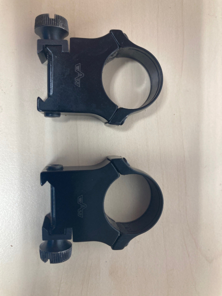 Zum Verkauf kommen Ringe für Weaver- oder Picatinnyschiene von EAW, Mittelrohrdurchmesser 1 Zoll/25,4mm, mit Rändelschraube, gebraucht. Sattelhöhe (=Abstand Oberseite Schiene bis Unterkante ZFR) 20mm. Gebrauchsspuren, aber voll funktionsfähig.