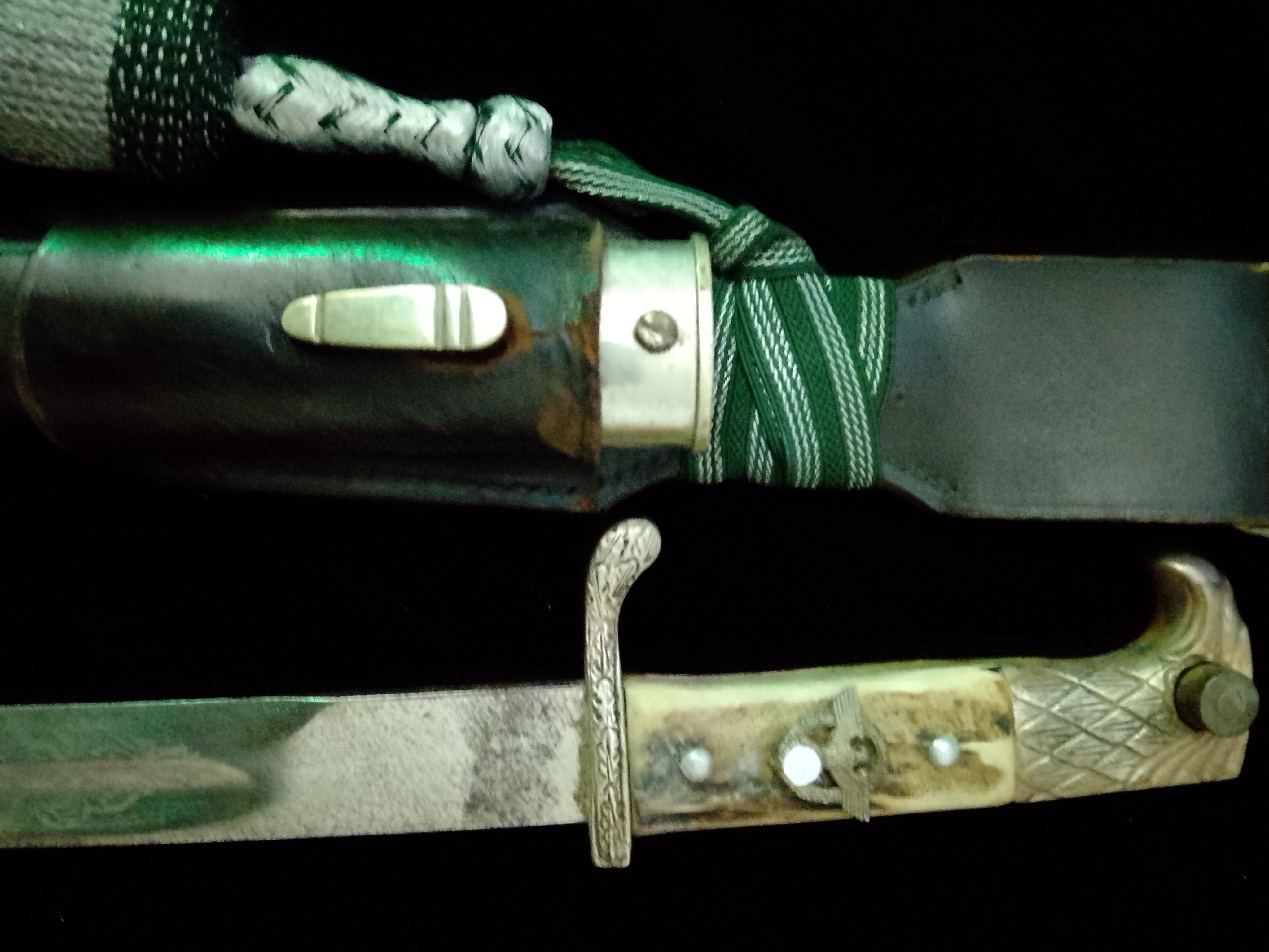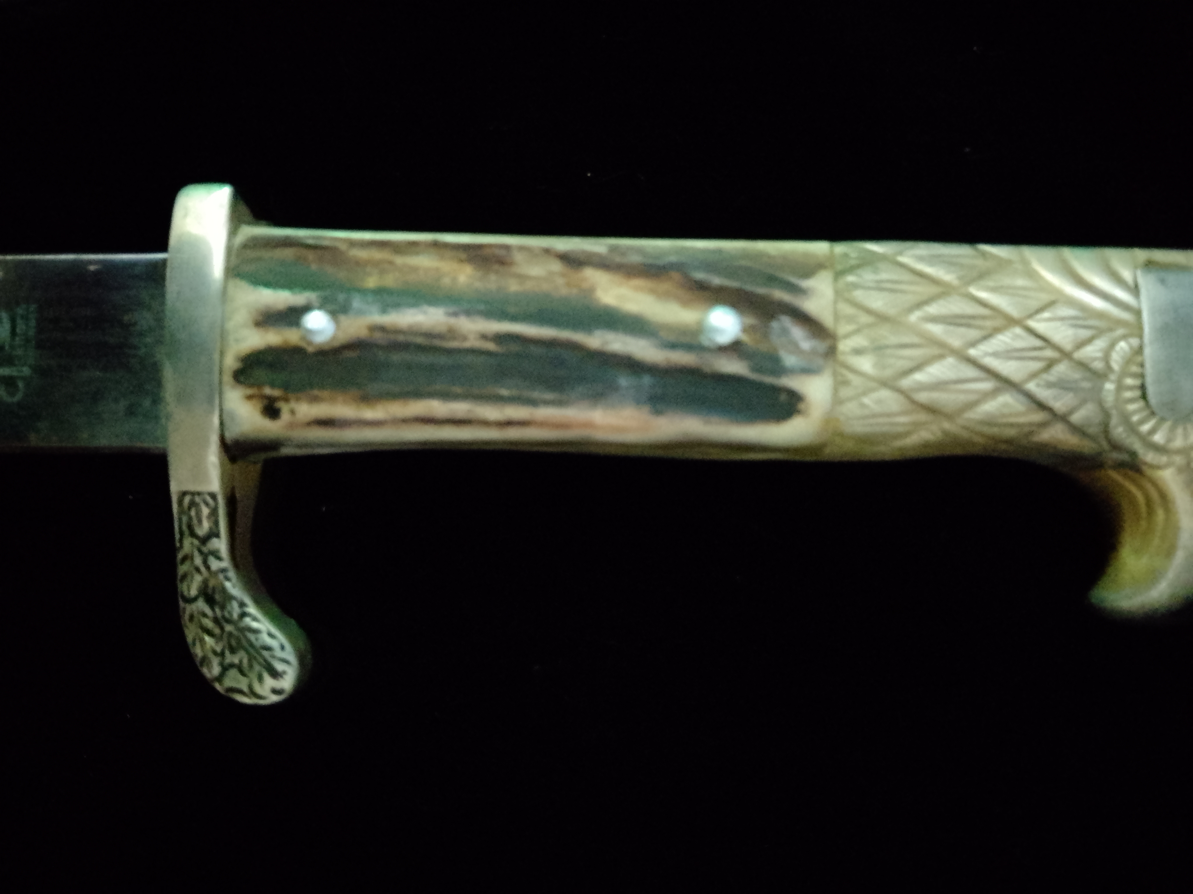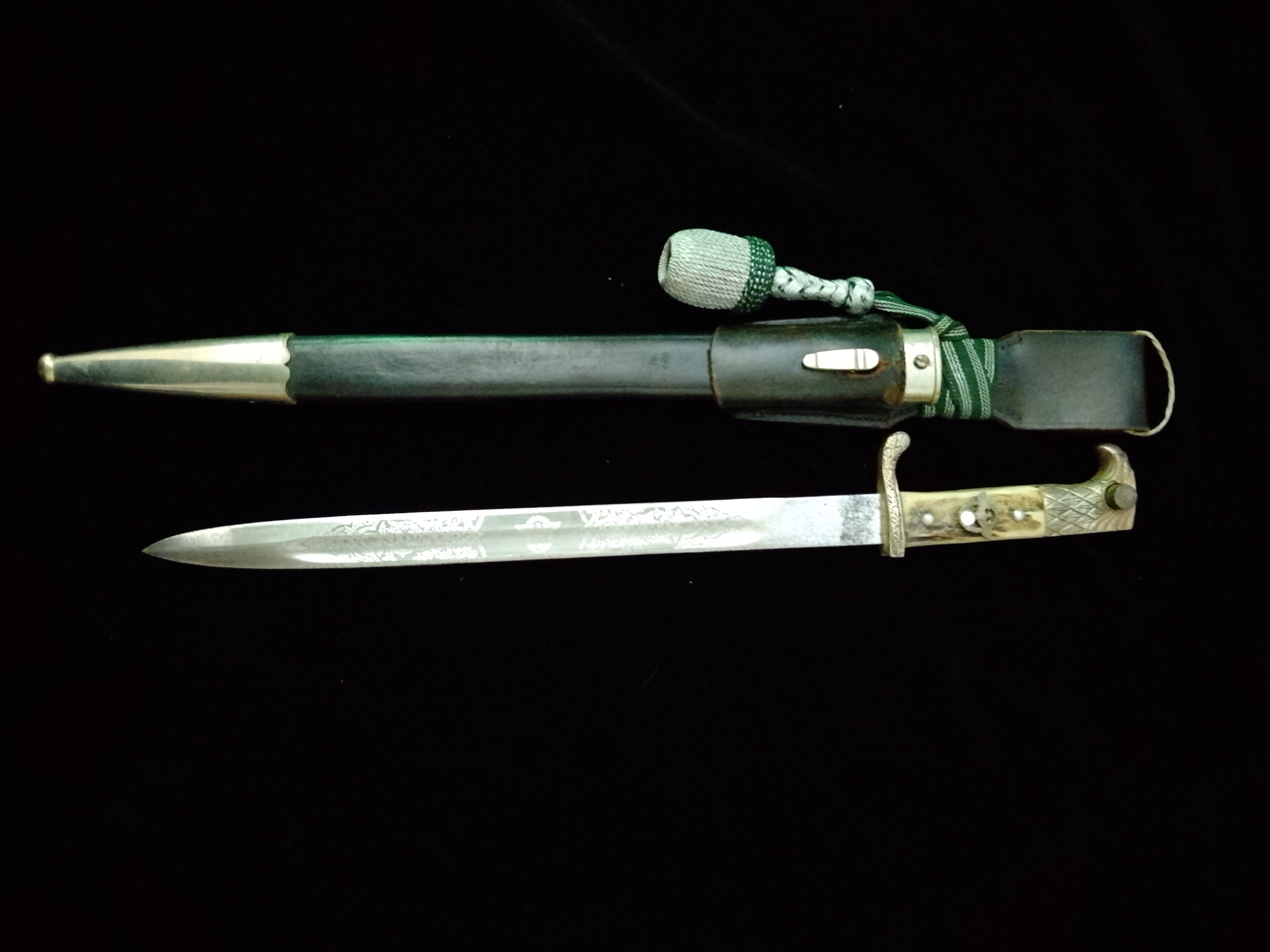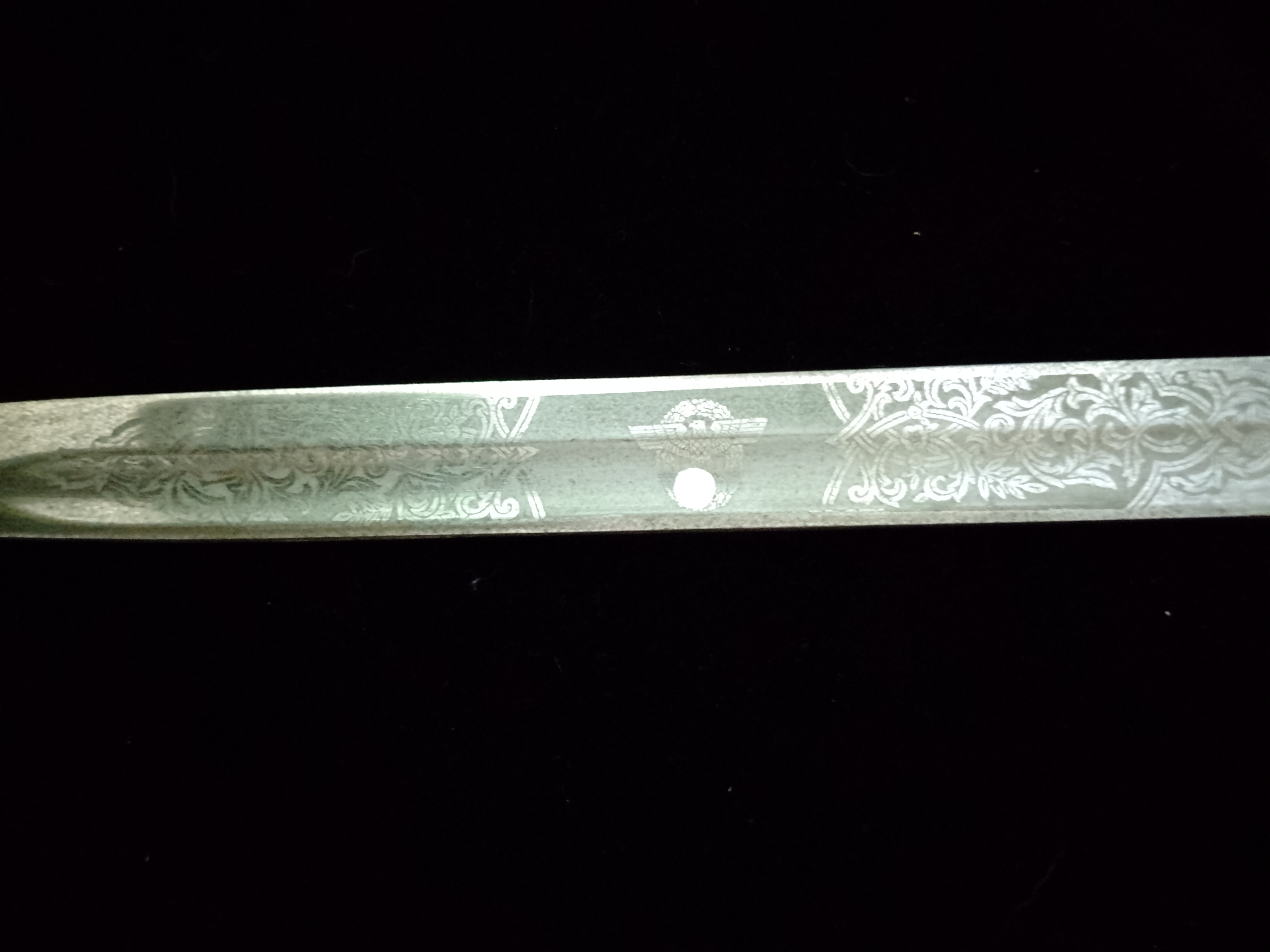 Stahlklinge mit Sonderätzung, vermutlich Privat beschafft, vs Ranken und Hoheitsadler, es Ranken und Sinnspruch.