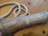 Pulverhorn/ Lippenhorn im Stil des 18.Jahrhunderts, Länge 33 cm, verschnitten, verziert mit Landkarte in scrimshaw, Hudon River , Delaware R. , Mohawk R. und Susquehanna, Siedlungsgebiet mit vorrangig deutschstämmiger Bevölkerung.... , hinterer Verschluss aus Nussholz mit Knochen- und Ebenholzeinlagen, Stopfen aus Nussholz gefertigt, ECHTEN HANDARBEIT !!!! EINMALIG !!!!