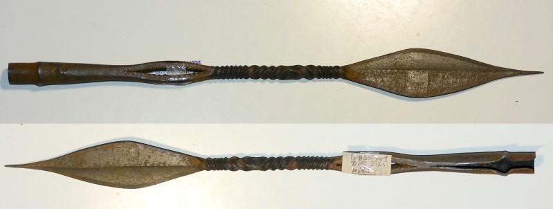 Afrikanische Speerspitze, Klingenlänge 13,7cm, Gesamtlänge 36 cm, Schaft mit Zierverdrillung und Durchbruch, guter Zustand