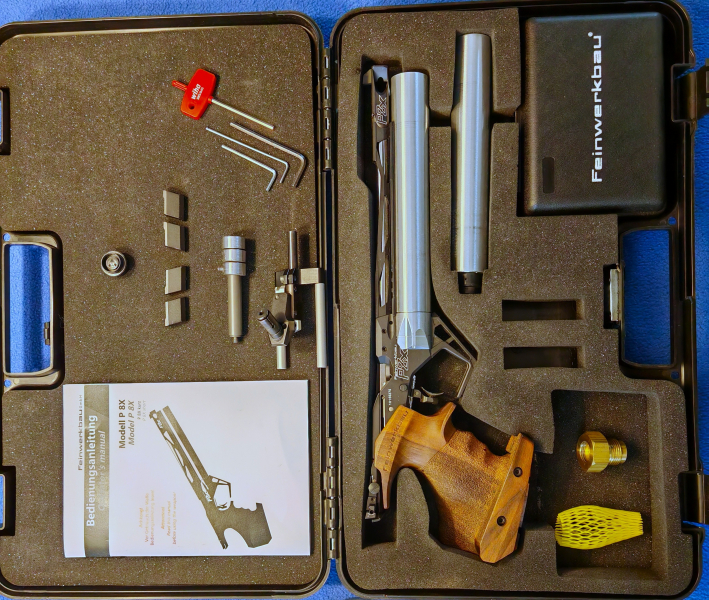 Feinwerkbau P 8X Komplett im Original-Koffer mit Zubehör (siehe Fotos). PLUS zusätzlicher Original Feinwerkbau-Auflage und Gewichtsstange. Waffe kann wahlweise zum Freihand oder zum Auflageschießen verwendet werden.