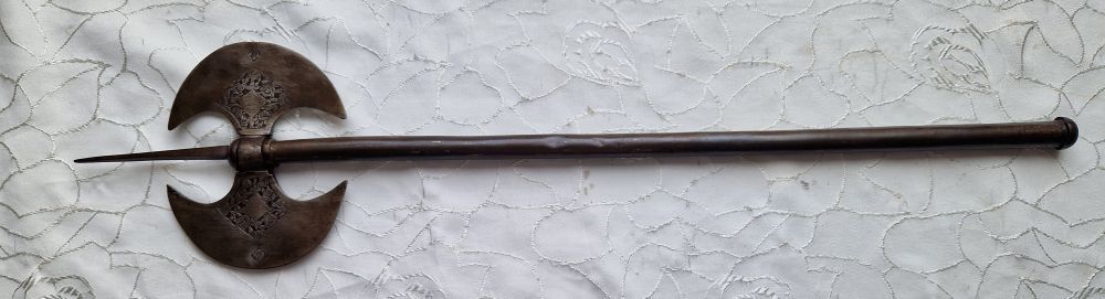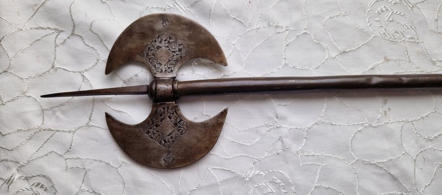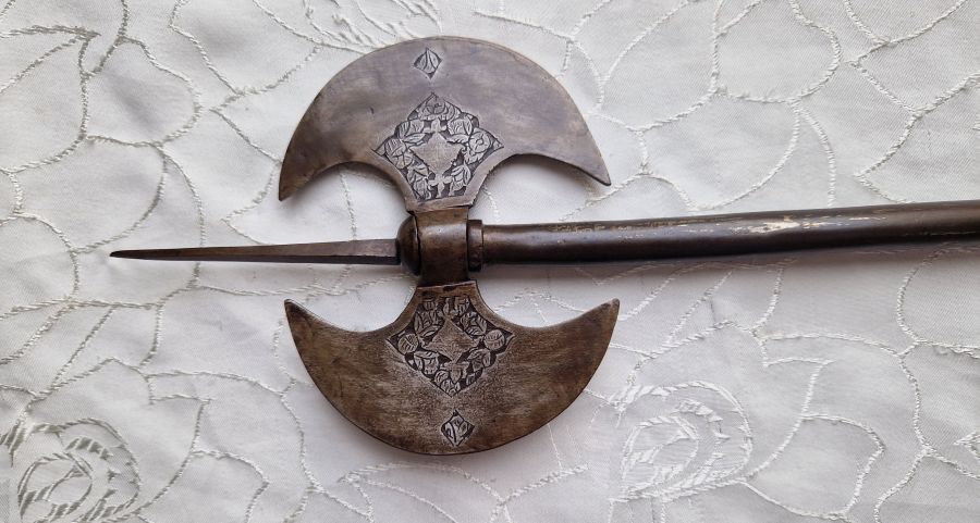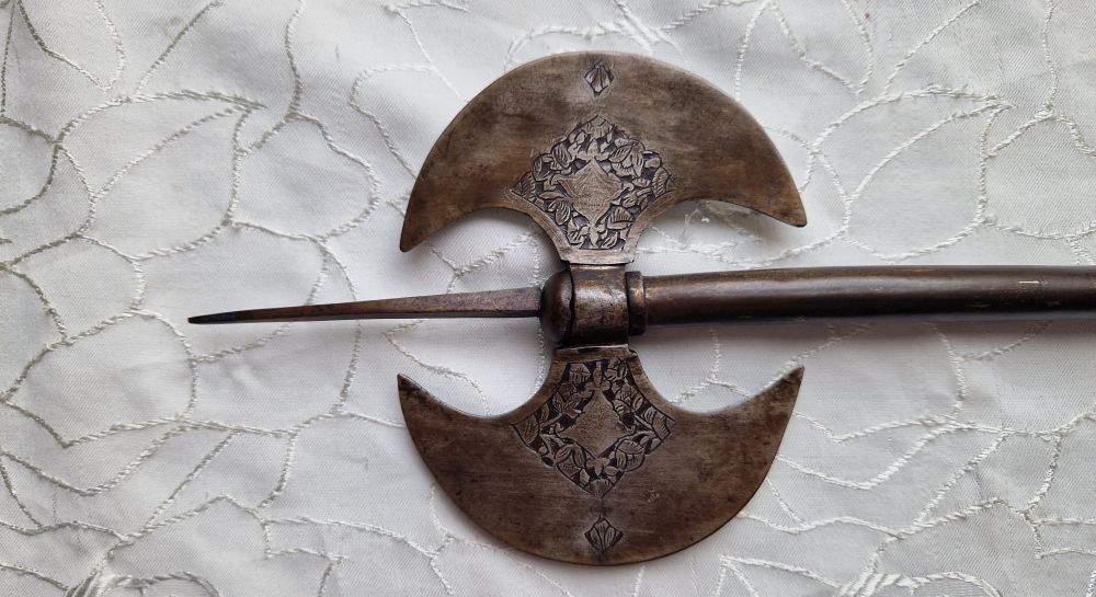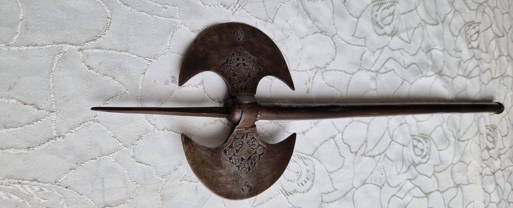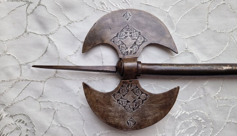 Antike Doppelaxt geätzt, Einlagen usw.