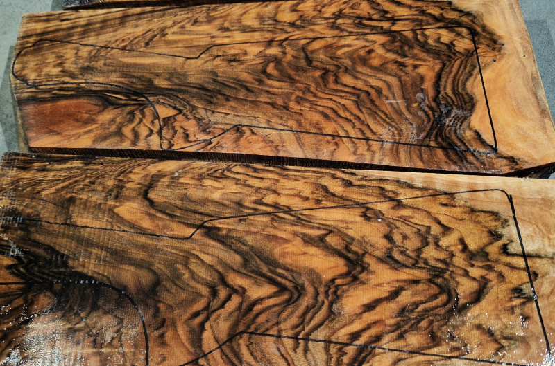 Die ersten Aufnahmen entstanden auf einem leicht angefeuchteten Holzbrett, um die Farben und die Schönheit des fertigen Produkts realistischer darzustellen. Das letzte Bild zeigt die Maße in Zentimetern. Die Konturen wurden auf die tatsächlichen Abmessungen der Blaser F3 übertragen. Die Teile wurden fünf Jahre lang luftgetrocknet. Auf Dampftrocknung wurde verzichtet, um die Farben und die natürlichen Harze des Holzes zu erhalten. Das Ergebnis ist ein elastischerer, festerer und schönerer Schaft.