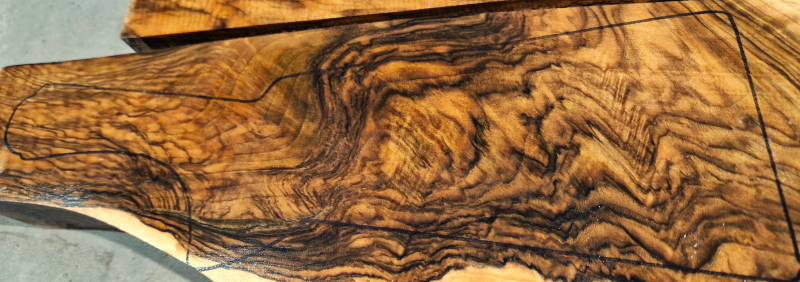 Die ersten Aufnahmen entstanden auf einem leicht angefeuchteten Holzbrett, um die Farben und die Schönheit des fertigen Produkts realistischer darzustellen. Das letzte Bild zeigt die Maße in Zentimetern. Die Konturen wurden auf die tatsächlichen Abmessungen der Blaser F3 übertragen. Die Teile wurden fünf Jahre lang luftgetrocknet. Auf Dampftrocknung wurde verzichtet, um die Farben und die natürlichen Harze des Holzes zu erhalten. Das Ergebnis ist ein elastischerer, festerer und schönerer Schaft.