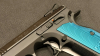 Die blauen Aluminium-Griffschalen bieten durch ihre aggressive Struktur hervorragenden Halt – auch bei längeren Wettkämpfen. Das 1 mm Fiberkorn unterstützt eine schnelle, intuitive Visieraufnahme.