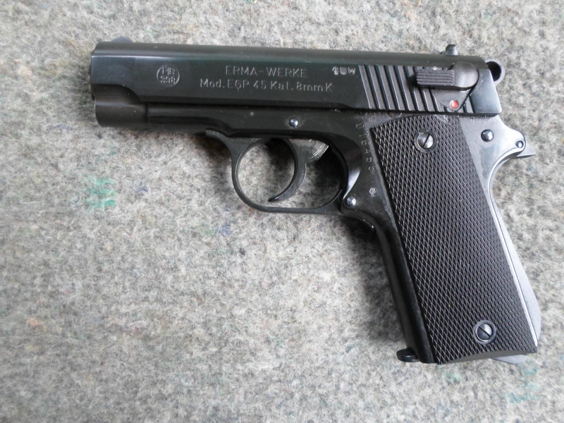 Erma EGP 45, Kaliber 8 mm Knall, gültiger Beschuß, PTB 398, 8 Schuß Magazinkapazität, Gewicht 600 g, Länge 160 mm, Höhe 110 mm, Breite 28 mm, mit Abschußbecher, keine wesentlichen Gebrauchsspuren, in nahezu neuwertiger Erhaltung.