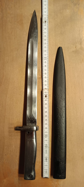 Nach meinen Recherchen im Internet vermute ich hier das Ersatzbajonett aus dem WW1 erster Weltkrieg, diese Angaben aber absolut ohne Gewähr. Falls mir jemand dies bestätigen kann oder mir den Hinweis auf etwas anderes geben kann, jederzeit gerne, da ich mit offenen Karten spiele. Da es aus einem Nachlass stammt, kann ich den Besitzer leider nicht mehr fragen.Das Gewicht des Bajonett beträgt ca.460 Gramm, das Gewicht der Scheide 180 Gramm. Gesamtlänge des Bajonett ohne Scheide ca 44cm, Klingenlänge ca 31,2cm.