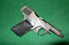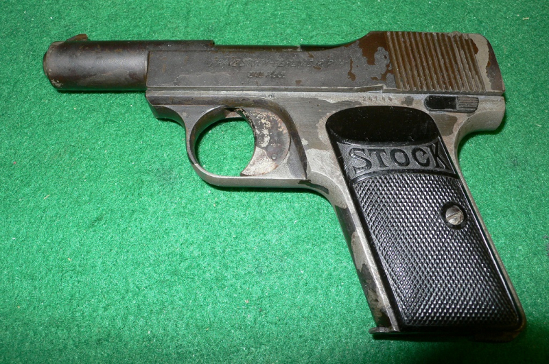 Halbautomatische Pistole der Firma " Franz Stock - Berlin " , Kal.: 7,65mm, mit leichten Schäden in der Lackierung, Um die Waffennummer freizubekommen, hat wohl jemand ein wenig feines Schleifleinen angesetzt ( !!!). Die Funktion der Waffe, ohne sie geschossen zu haben, ist da. Der Lauf ist nicht mehr spiegelblank, aber ohne Rost.