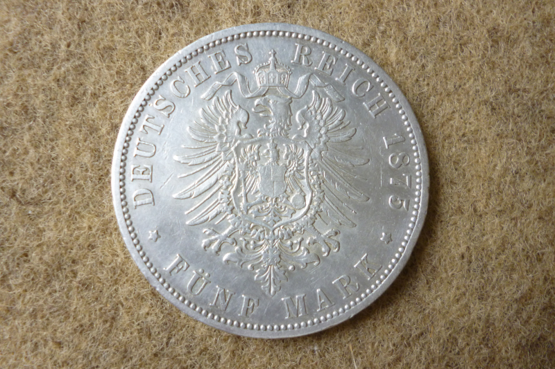 Fünf Silbermarkstück, Deutsches Reich 1875, : "Wilhelm Deutscher Kaiser König v. Preussen". Umlaufend: Gott mit uns.