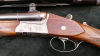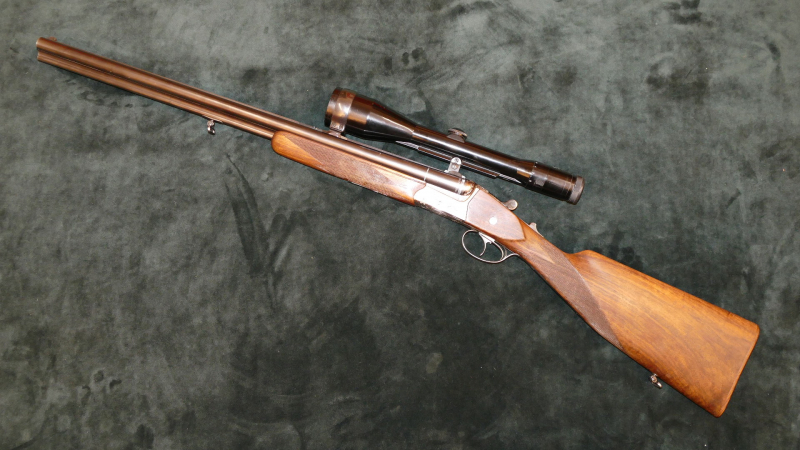 Krieghoff Drilling Mod. Trumpf, Kal. 7x64 (wirklich!) und 16/70, die Schrotschlosse sind als Selbstspanner konzipiert, das Kugelschloß wird mittels eines Schiebers auf der Scheibe gespannt, dabei klappt das Visier auf. Schiebesicherung ebenfalls auf der Scheibe, Rückstecher im vorderen Abzug, per SEM ist ein Zeiss Diavari-Z 2,5-10x52 mit Absehen 4 montiert, altersgemäß guter Zustand, Beschuß 1976, Verschluß dicht. Schußleistung sehr gut, siehe Bild: 5 Schuß mit Geco 11,0g TM auf 100m. Läufe innen blank (im rechten Schrotlauf ist zusätzlich noch ein Krieghoff Einstecklauf EL44 im Kal. .22Mag. montiert). Lauflänge 63,5cm, Schaftlänge 37,5cm, Gesamtlänge 107cm. Als Besonderheit hat diese Waffe einen (wahrscheinlich nicht von Krieghoff original) Fischbauchschaft ohne Backe und mit Holzabschlußkappe. Die Waffe ist in einem sehr gepflegten Zustand. Ziemlich gelitten hat leider die rechte Seite des Vorderschaftes.