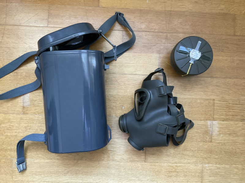 Gasmaske von der Schweizer Armee un Kunstoffköcher mit versiegeltem Filter