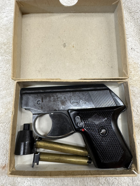 zum Verkauf steht eine Schreckschusspistole Aetna Mod G / G2 (Auf der Waffe steht Typ G, auf der Verpackung G2) im Kaliber 6mm Flobert. Die Waffe stammt aus einer Sammlerauflösung und ist in einem guten Zustand. Auf der rechten Seite ist ein kleiner Riss im Griffstück (siehe Bild). Mit dabei sind insgesamt drei Magazine, der Abschussbecher und eine Reinigungsbürste. Alles in der OVP. Diese hat an einer Seite einen Riss (siehe Bild).