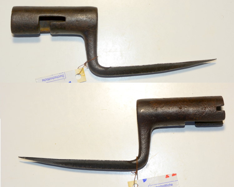 Tüllenbajonett mit 11,9 cm langer starker Klinge, Tüllen-Innendurchmesser 22cm (passend für franz. Inf. Gewehr 1822), noch ohne Feststellring, alte Rostpatina