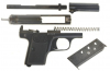 Raffinierte Zerlegbarkeit: Anheben der Visierkimme entriegelt eine herausziehbare Schiene, woraufhin der mit einem Nocken im Griffstück fixierte Lauf hinten angehoben  und mit dem Verschluß zusammen nach vorne abgezogen werden kann.