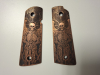 PAX PER MORTEM 1911 pistol grips art was created in house by artist Kade Strange. The grips are machined solid copper billet, with our art deep engraved into the metal. Perfect for those looking for aggressive texture. Once engraved, we put a few extra hours of finishing into the set.. first with hand polish, then the first patina process which gives the 3D depth with dark browns in the recesses, then a 2nd hand polish process, then lastly, a time consuming hand applied "color" patina that uses heat to create a "Color Case" style finish on the copper. Color case will show rainbow like hues intermixed with browns and greys. This last patina adds another layer of depth as well as color. Yes, its a bit more expensive, but represents hours of handwork!