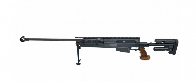 The legendary “Mini-Hecate” sniper rifle, also known as the PGM 338, used by the GSG-9 in .338 Lapua Magnum caliber (8.6 × 70 mm). Mainly used as an anti-personnel or light anti-material rifle for combat ranges of 500–1200 m. It was manufactured in France by PGM Précision. The PGM 338 is built on a solid chassis and receiver housing made of high-strength aluminum and is significantly more resilient than other modern sniper rifles, which use many plastic parts. The breech and the barrel sleeve, in which the breech head locks with three locking lugs, are made of high-alloy steel. The free-floating precision barrel made of cold-forged steel is manufactured exclusively for PGM Précision by the German company Lothar Walther. The two-stage trigger can be adjusted in terms of trigger resistance by a specialist company. The rifle scope, a residual light amplifier, or laser aiming aid can be attached to the PGM 338 without play using various Picatinny rails. The impressive muzzle brake reduces recoil to the level of a .308 Win (7.62 x 51 mm) and can be easily removed for mounting a silencer. The weapon comes with two ten-round box magazines. In addition, the PGM 338 has a side-folding shoulder rest that can be adjusted in length and height to suit the individual shooter. Furthermore, the PGM 338 has a side-folding shoulder rest that can be adjusted in length and height to suit the individual shooter. In addition, the cheek rest and parts of the fore-end can be replaced with special wooden parts that were made exclusively in Germany for the original owner, but were never installed on the weapon. These wooden attachments are not available as standard. The weapon also features a Karl Nill sniper grip made of walnut, which was built exclusively for PGM Précision and has a height-adjustable palm rest. A special highlight is the heavy Peli Case gun case that comes with the weapon, with a foam insert tailored to the weapon and its accessories. It doesn't get any more Special Forces Sniper than this! Only a very small handful of these weapons were sold to civilians in Germany. Until the switch to a new weapon, the GSG-9 used the majority of them. Only 5 shots were ever fired after the weapon was purchased in order to zero the scope. An absolute and extremely rare collector's item in unused, new condition for connoisseurs of high-quality sniper weapons that leaves nothing to be desired.