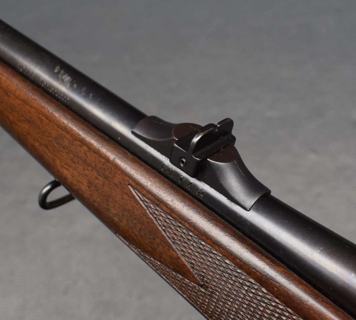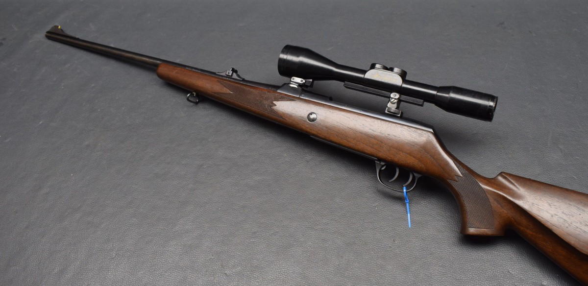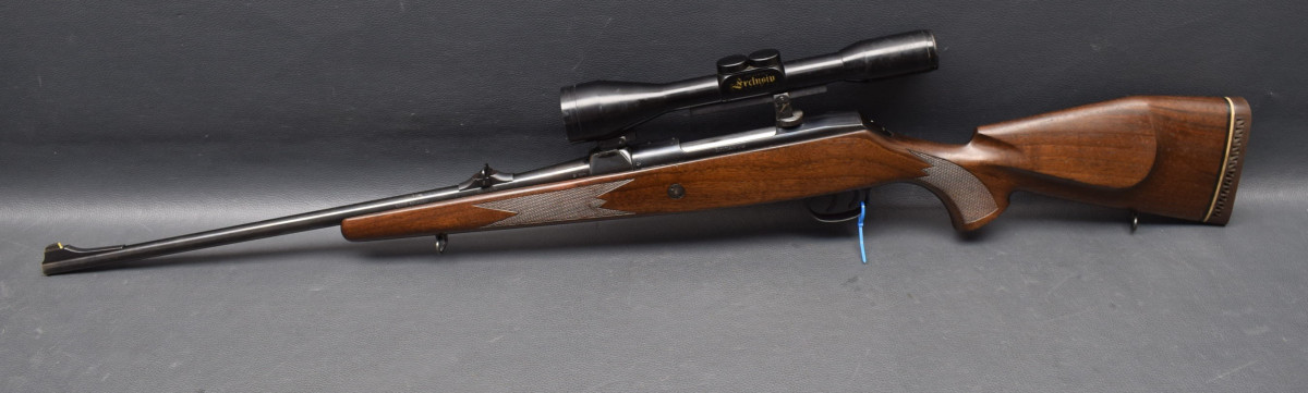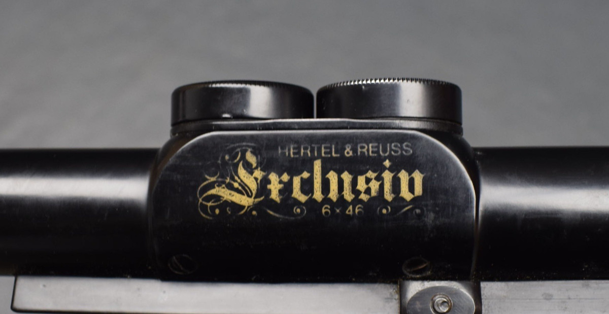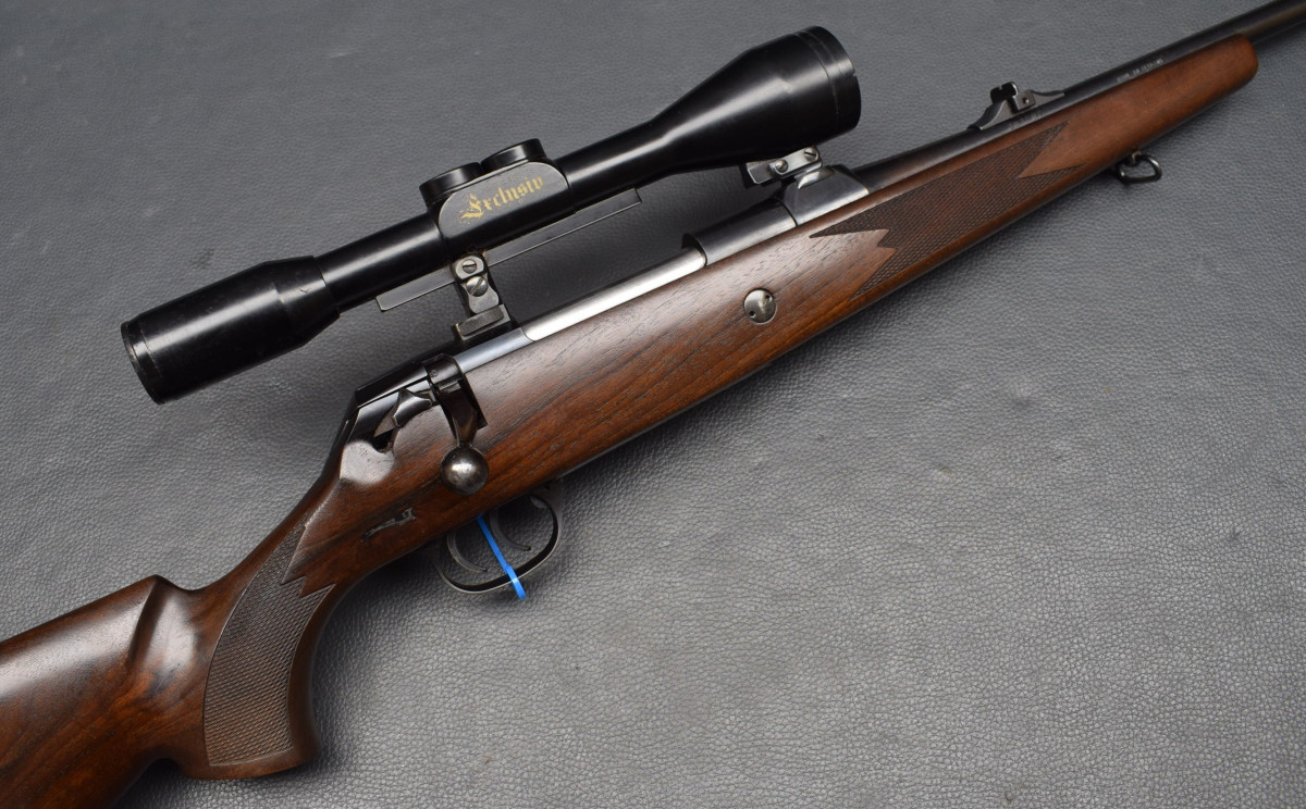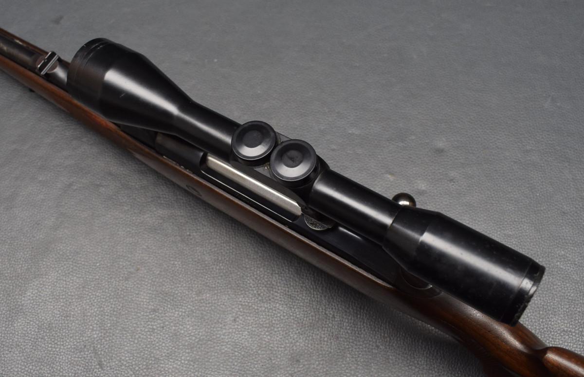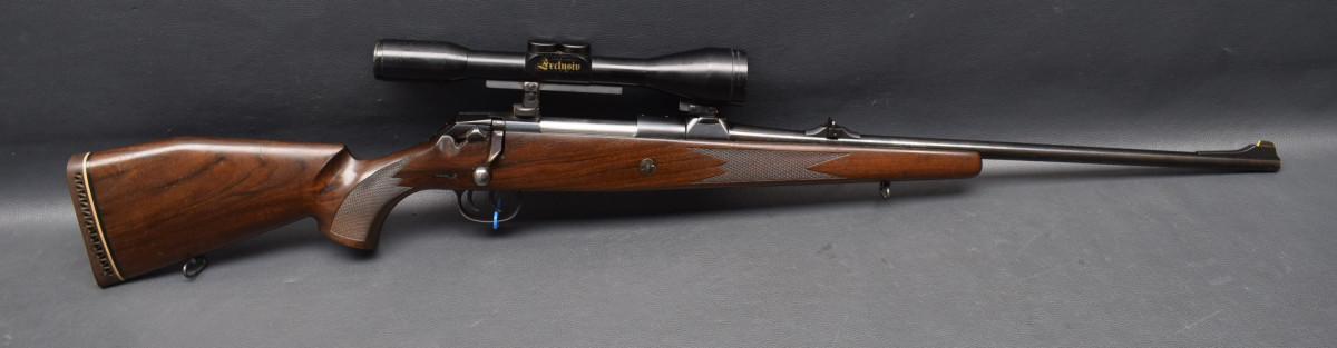 Deutscher Stecher, 4-Schuß Klappdeckelmagazinkasten. Montiert mit ZF Hertel & Reuss 6x46Abs.1, mittels SEM Montage. Nußbaumschaft mit deut. Backe, Gummischaftkappe & Riemenbügeln.