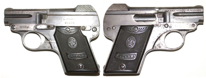 Österreichische Taschenpistole M 1908.  Die Pistole war durch ihr geringes Gewicht und Handlichkeit eine beliebte private Offizierswaffe.. Die Tageweise wurde sowohl offen, als auch verdeckt durchgeführt.