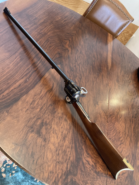Hier kommt zur Versteigerung eine sehr seltene, schöne und sehr gepflegte Revolver-Büchse im ORIGINAL-HEGE-UBERTI, Mod. AMERICAN-MATCH-CARABINE im Cal. 357 MAGNUM, fest montierter Langschaft mit Messing-Schaft-Kappe, bunt gehärteter Rahmen.