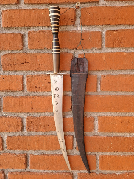 Sie bieten auf einen alten, sehr gut erhaltenen Dolch aus afrikanischer Fertigung. Der mit einem Parierelement aus Messing versehende Griff aus Tropenholz mit Beineinlagen bietet sehr guten halt. Zum Lieferumfang dieses handgefertigten Dolches gehört eine Lederscheide welche mit Verzierungen versehen ist. Die Klingenlänge beträgt ca. 33,5 Zentimeter bei einer Gesamtlänge von ca. 52,0 Zentimeter (Dolch in der Scheide). Sicherlich wird dieser alte, afrikanische Dolch zur Bereicherung ihrer Sammlung beitragen. Versand nur innerhalb von Deutschland, kein internationaler Versand, auch nicht innerhalb von Europa. Privatverkauf ohne Rücknahme, Garantie oder Gewährleistung. Keine Nachverhandlung von Versandkosten und Geboten! No international distribution.