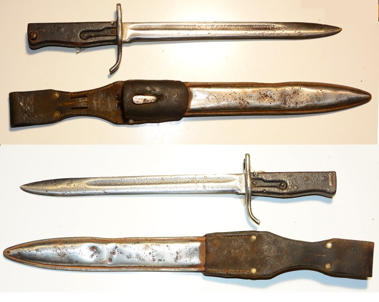 Deutsches Ersatzbajonett mit Blechprägegriff,29,3cm lange Klinge, Scheide und Bajonett mit Rostnarben, Klinge überschliffen, mit Koppelschuh