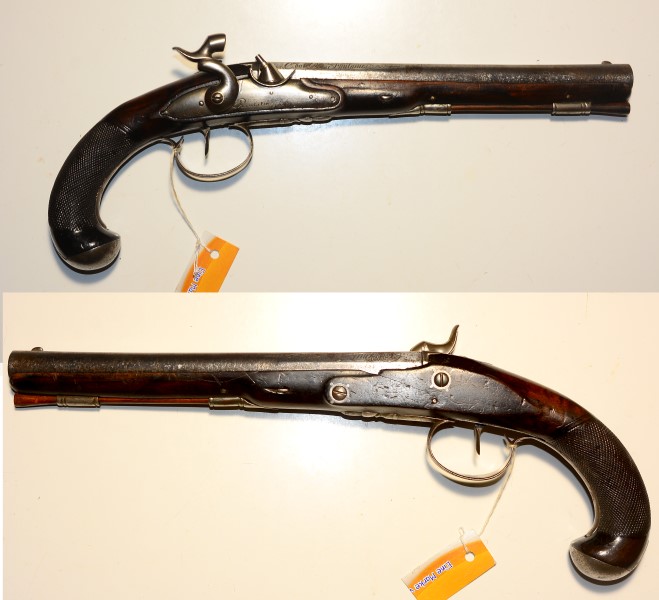 Französische Perkussionspistole, aptiert von Steinschloss, Lauf markiert " Peniet á Paris - Cour des Fontaines", Schloss mit "Peniet á Paris", Lauflänge 24,3 cm, Gesamtlänge 38,2cm, Visiereinrichtung, am Kolben eine Kupplung zum Anstecken eines Gewehrschafts.