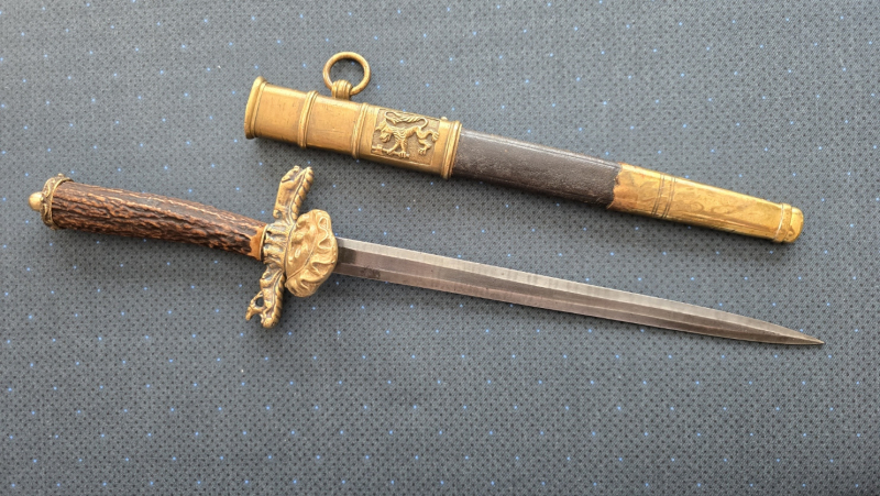 Gesamtlänge ca 44 cm. Hirschhorngriff, Messing Griffteile und Scheidenbeschläge.