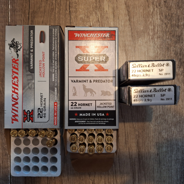 Biete Restmunition im Kaliber .22 Hornet. 81 Schuss Winchester und 39 Schuss S&B. Da Privatverkauf, weder Garantie noch Rückgabe!