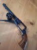 Biete einen sehr selten angebotenen Western Remington New Army, PTB 304, 9 mm Knall an, ehemals Scharfe Waffe zum 9 mm Knall umgebaut, zerlegbar, Züge und Felder gut sichtbar, geringe Laufsperre, Vollstahl bis auf einige Messingteile. Gebrauchtspuren für das Alter entsprechend. Flecken auf der Waffe sind Spiegelungen, Herstellungsjahr KB, Hersteller/ Importeur Neumann ( vermutlich Pedersoli ). Mit der Beste Revolver der je in 9 mm Platz Umgebaut wurde. Wird im Neuzustand mit 2600 bis 2800 € gehandelt im Fachhandel. Der Verkauf erfolgt ohne Garantie, Umtausch oder Gewährleistung da Privatverkauf. Bitte bei der Überweisung nur als Verwendungszweck die eGun Auktionsnummer angeben. Ich versende nur mit Versicherung bis 2000 € bei DHL und Sendungsverfolgung.