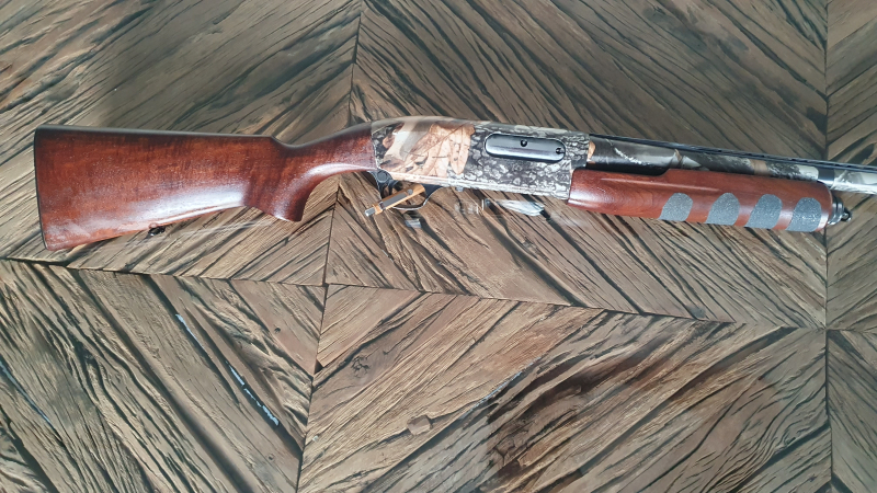 Zum Verkauf steht eine Vorderschaftrepetierflinte (Pumpgun) im Kaliber 16/70. Dieses seltene und zeitlose Stück hat ein schlankes Gewicht von 2,8kg (ungeladen) bei einer Schaftlänge von 35cm. Der 1/2 Fixchoke ist ein guter Allrounder. Das Magazin fasst 3 Schuss. Die Folierung lässt sich bei Bedarf mit einem Heißluftföhn leicht lösen, ebenso die Grippfolie am Vorderschaft. Verkauf wegen Kaliberwechsel. Die Flinte ist gebraucht und weist dementsprechend auch hier und da ein paar Gebrauchsspuren auf z.B.: Brünierung am Abzugsbügel abgegriffen, Folie vorne unterm Lauf abgerieben (Kamerahalterung), Folie vorm Systemkasten abgerieben durch den Repetiervorgang. Zustand siehe Fotos.