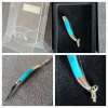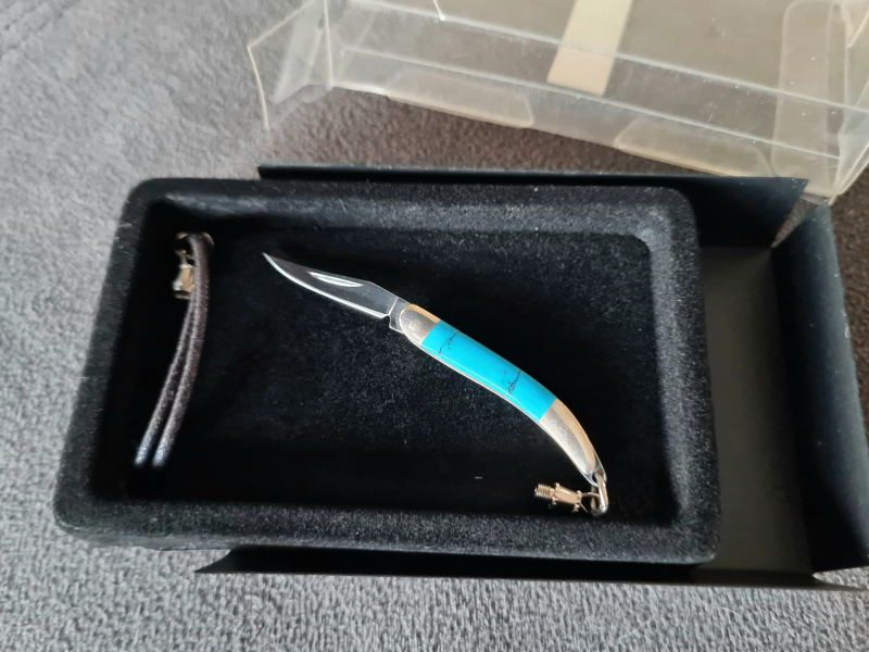 NEUWARE: Siehe die Fotos - Sie kaufen genau das Messer, welches Sie hier sehen. Unbenutzt - einige Jahre alt - lag immer nur im Tresor - wurde nie komplett ausgepackt. Das Messer kann man von der Kette abschrauben und dann nutzen. Auf dem Messer selbst steht nichts. Das Schmuck-Messer ist noch in der original Verpackung.