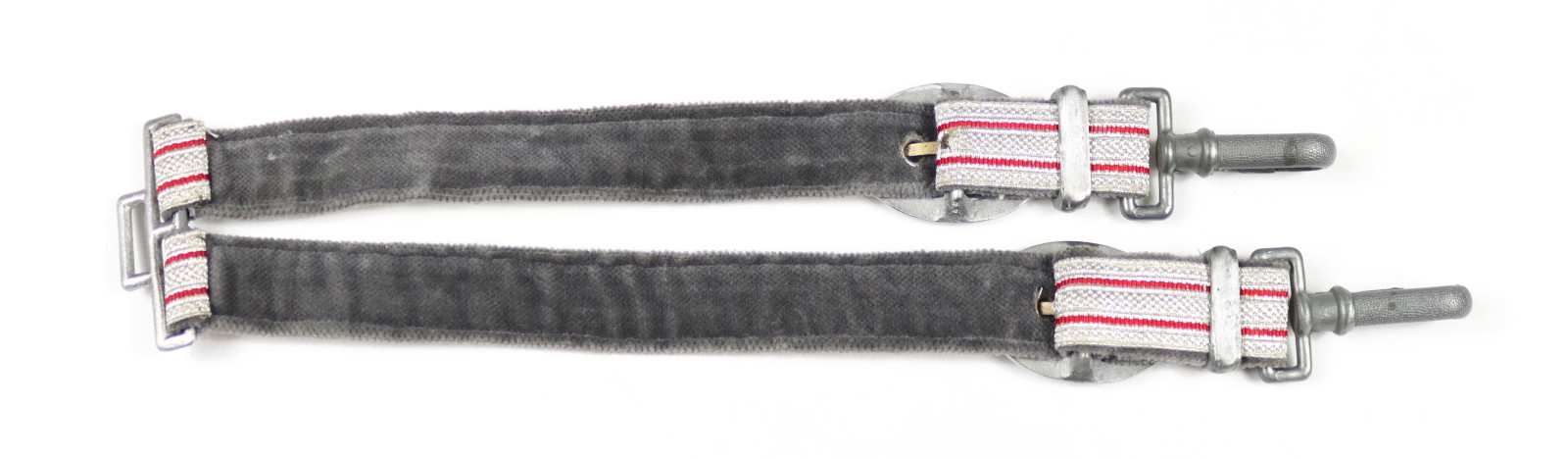 Angeboten wird ein DRK Dolch-Gehänge bestehend aus zwei Riemen mit silber/rot gewebten Bändern, Beschlägen und Karabinerhaken aus Aluminium und Zink. Rückseite mit grauem Filz/Velours. Ideal als Ergänzung für DRK-Dolch. Guter Zustand. Bitte Fotos als Bestandteil der Beschreibung beachten.