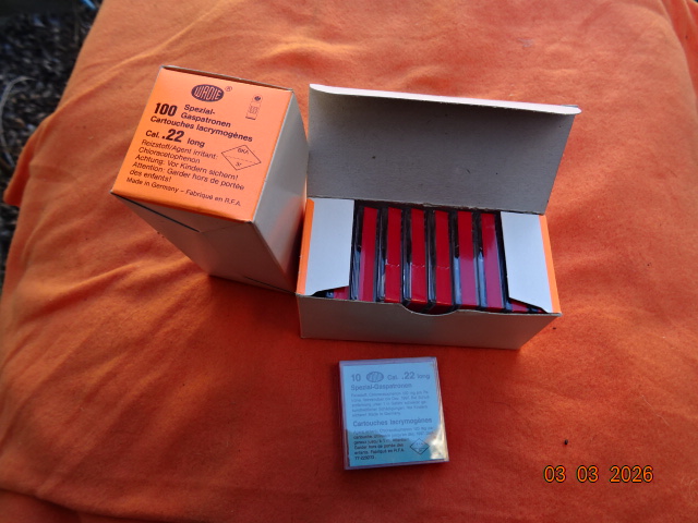 Biete hier 2 ganze Kisten a 100 Schuss alte schon lange abgelaufene CS Gas Patronen kal.22 Long Platzpatronen!Die Patronen waren immer trocken gelagert worden!Angebot von Privat,keinerlei Garantie und Rücknahme!!