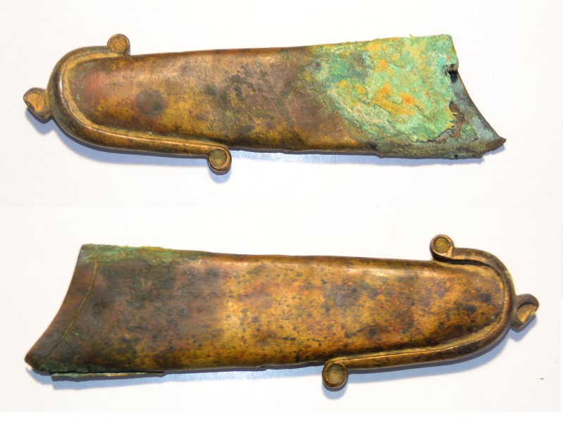 Ortblech aus dickem Messingblech, von orientalischem Säbel Ende 19. bis Anfang 20. Jahrhundert, Länge ca. 18cm, Breite oben 4,2 cm, rechte Seite oben mit Textilresten altersbeding angelaufen, Vorderkante oben 4cm der Lötnaht offen