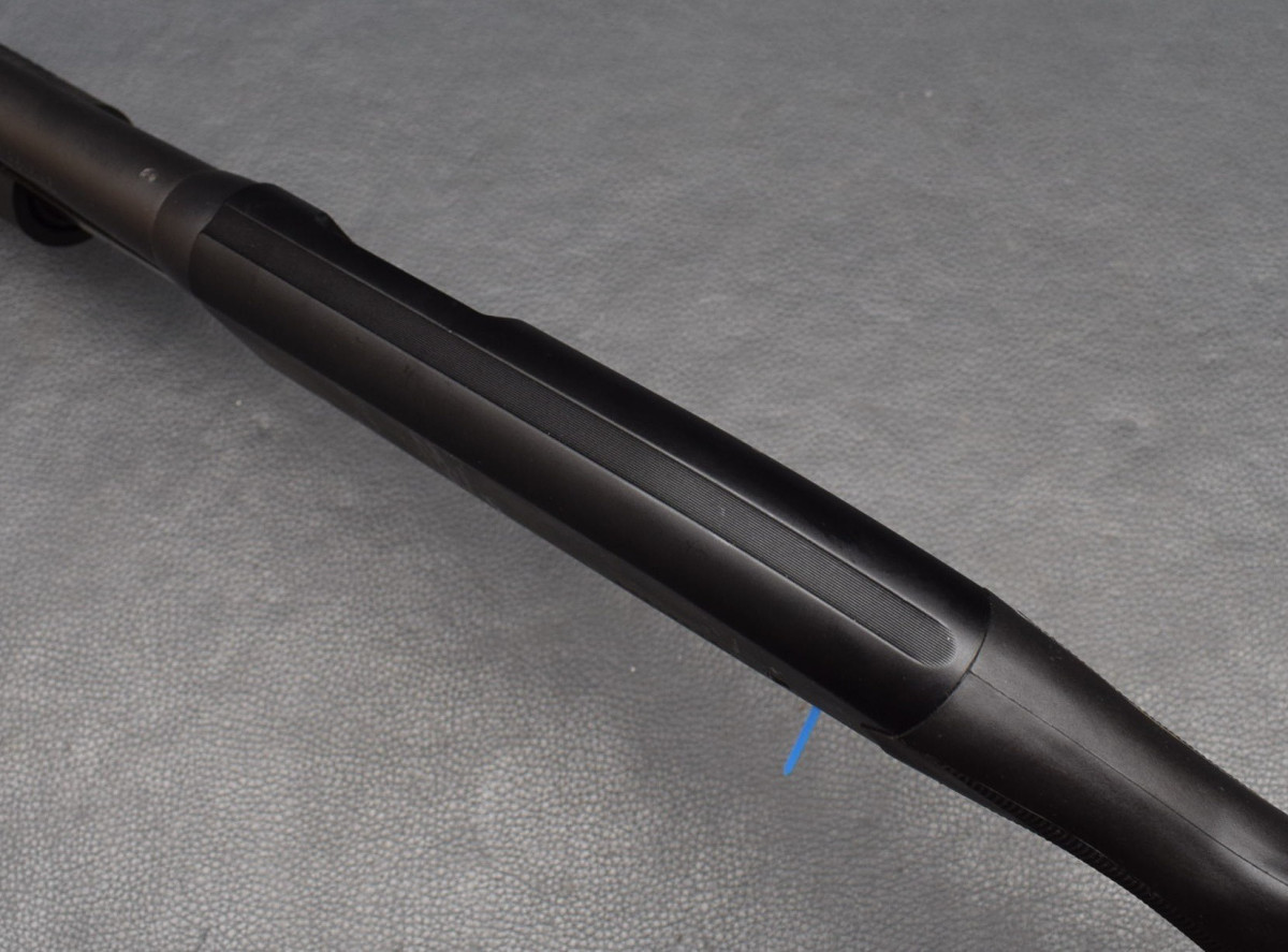 Messing Korn, Alu-System, Druckpunktabzug, Druckknopfsicherung am Abzugsbügel, Magazinrohr unter dem Lauf. Kunststoffschaft ohne Backe, mit Gummischaftkappe und Riemenbügelbasen. Lauf sehr gut, Brünierung 96%, Schaft sehr gut Gebraucht, gut