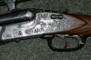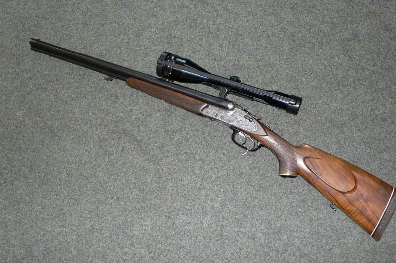Heym-Kastenschloß-Drilling mit langen Seitenplatten und Sicherungshebel auf dem linken Schloßblech. Die Waffe ist voll graviert auf rechter Seite - Rehwild und linke Seite - Rotwild. Die Waffe hat das Kaliber 16/70-7x65R und einen Einstecklauf VVV, im Kaliber .22 Hornet. Montiert ist mit SEM ein Zeiss Diatal Z 8x56 Abs.: 1, oh. LA. Die Waffe hat einen ausgesucht schönen Nußbaum-Ölschaft mit sehr guter Maserung und Gummi-Abschlußkappe. Die Schaftlänge beträgt 37,0 cm. Die Rohre sind blank und die Waffe macht einen sehr gepflegten Eindruck. Der Schaft hat ein paar winzige Gebrauchsspuren. Die verschwinden fast in der guten Maserung des Holzes. Die Brünierung hat ein paar kleine Stellen, siehe Fotos. Die Waffe kann auf Wunsch, gegen Mehrpreis, eingeschossen werden.