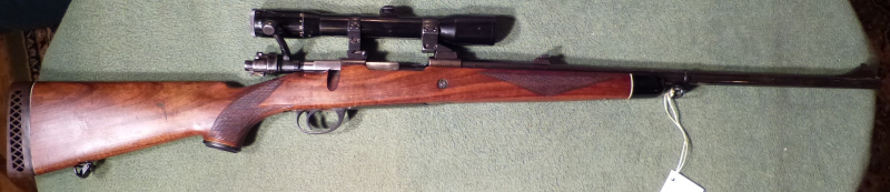 Wir bieten im Auftrag von privat aus einem Nachlaß ohne Garantie, Gewährleistung, Sachmängelhaftung und Rücknahme einen Großwildrepetierer im Kaliber 375 H&H an. Der Lauf ist in einem sehr guten augenscheinlich kaum geschossenen Zustand mit scharfkantigem Zug- Feldprofiel. Die Waffe wurde nur einmal in Afrika auf Safari geführt und einige Male auf dem Schießstand geschossen, die Waffe stammt aus Erstbesitz und wurde pfleglich behandelt und super gepflegt. Die montierte Schwenkmontage ist in einem sehr guten Zustand. Das montierte ZFR Zeiss DIAVARI 1,5-6x wurde für die Afrika Jagd montiert und eingeschossen, es wurde von einer anderen Waffe entnommen und die Montageschiene entfernt, es sind Gebrauchsspuren sichtbar. Der Systemkasten kann zur Patronenentnahme nach unten durch einen Hebel aufgeklappt werden. Als Sicherung ist die klassische 3 Stellungssicherung verbaut. Der vordere Riemenbügelhalter ist abnehmbar und über den Lauf gezogen und dadurch Tragegünstig positioniert worden, der Riemenbügel am Hinterschaft ist ebenfalls abnehmbar. Der Abzug wurde optimiert und löst trocken und ohne zu kriechen aus. Durch die Porterung (6 Fach) des Laufes ist eine starke Reduzierung des Rückschlages erreicht worden. Der formschöne Holzschaft mit Edelholzabschluß befindet sich in einem guten Gebrauchszustand mit einer auf der rechten Schaftseite und an der linken Seite (rote Kennzeichnung) befindlichen Abschabung von der Waffenschranklagerung. Der Schaft ist fast gerade geschäftet, so das er für Rechts- sowie für Linksanschlagschützen geeignet ist. Der Abstand von der ventilierten Gummischaftkappe zum Abzug beträgt ca. 36 cm. Der Verschlußgang ist leichtgäng und flüssig. Mit entsprechender Munition ist der Repetierer nicht nur in Afrika (auf Big Vier) sondern auch als Revierwaffe in Europa einsetzbar und hat eine hohe Augenblick- und Stoppwirkung.