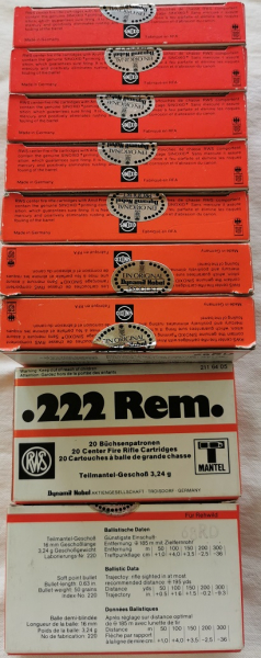 RWS Munition; Kaliber .222 Remington; 9 Packungen, davon sind zwei Patronen abgeschossen, also gesamt 178 Schuss; nummerngleich und die meisten Packungen sind noch originalverpackt und ungeöffnet. Geschossgewicht 3,24 Gramm; Geschosstyp Teilmantel; Bild vorhanden.