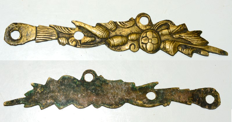 Original Gegenplatte von Schloss, von historischer Perkussions- oder Steinschlosspistole, Messing mit Reliefdarstellung, Länge 12,2 cm und maximal 22mm breit, guter Zustand