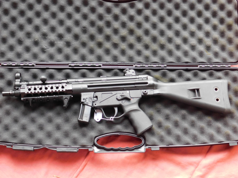 Pistolenkarabiner MKE T94 A2 ein Nachbau der MP5 von Heckler und Koch. Kal. 9 mm Luger, gültiger Beschuss! 10 Schuss Magazin. Sportlich nicht zugelassen! Sehr guter Zustand, meiner Meinung nach fast neuwertig. Montiert ist ein Quad Rail Vorderschaft. Alles im original MKE Koffer