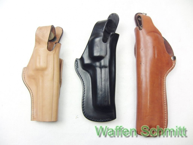 Sie bieten auf ein Konvolut aus 3 Lederholstern für Revolver. 1x braunes Lederholster Bianchi für 4“Revolver, 1x braunes Lederholster AKAH für 6“ Revolver, 1x schwarzes Radar Lederholster für 4“ Revolver. Guter Zustand!!!
