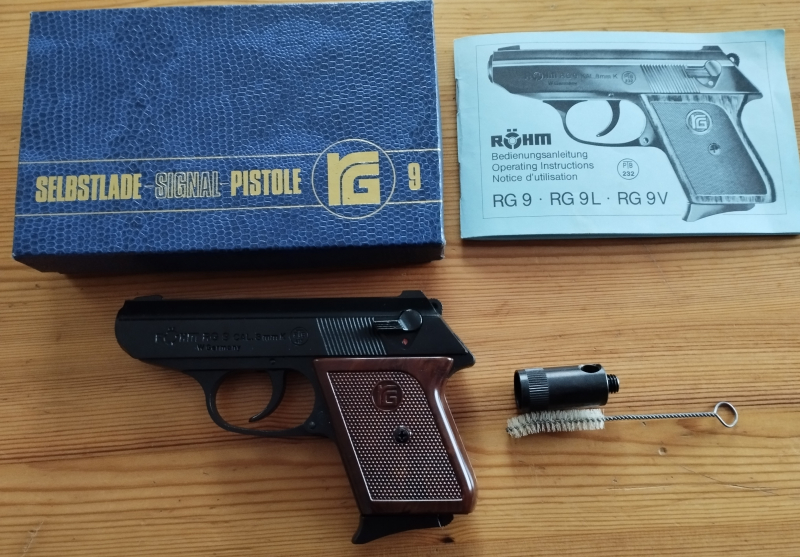 Röhm RG 9, Kal. 8mm. Mit original Zubehör: Putzzeug, Schachtel, Abschußbecher, Handbuch. Eine Originalrechnung von 1991 ist auch noch vorhanden.