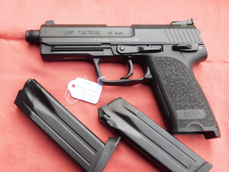 HK USP Tactical Kal. 45 ACP mit Reservemagazin, kein weiteres Zubehör. Lauf innen spiegelblank und Profil scharf. Gültiger Beschuss vorhanden. Meiner Meinung nach minimale Gebrauchsspuren.